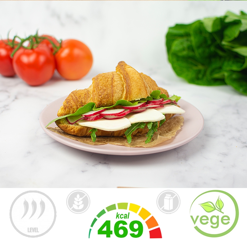 Składniki: Croissant wieloziarnisty 45,7% (croissant (mąka: PSZENNA, prażona słodowa, JĘCZMIENNA, woda, oleje i tłuszcze roślinne: palmowy, słonecznikowy; syrop glukozowo-fruktozowy, drożdże, masło /MLEKO/, cukier, JAJA, siemię lniane brązowe, nasiona słonecznika, sól, nasiona maku, siemię lniane żółte, nasiona dyni, ziarno SEZAMU, GLUTEN PSZENNY, naturalny aromat, enzymy, środek do przetwarzania mąki: kwas askorbinowy) 100%), Ser wędzony 27,1% (Ser wędzony (MLEKO pasteryzowane, sól, bakterie fermentacji mlekowej, chlorek wapnia, podpuszczka) , Dip żurawinowy 13,7% (jogurt grecki /z MLEKA/ 39,6%, majonez (olej rzepakowy, olej SOJOWY, ocet spirytusowy, żółtko JAJA, przyprawy (GORCZYCA), sól, regulator kwasowości: kwas cytrynowy, naturalny aromat, sól wapniowo-disodowa EDTA) 39,6%, żurawina (owoce żurawiny 45%, cukier, woda, skrobia, substancja żelująca: pektyna) 19,8%, sok z cytryny 1%), Konfitura z czerwonej cebuli 6,8% (cebula czerwona 80,8%, ocet winny czerwony (wino, PIROSIARCZYN potasu) 9,6%, miód 5,6%, oliwa z oliwek 4%, rozmaryn 0,1%), Rukola 6,8%.