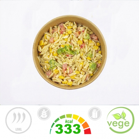 Składniki: Makaron orzo (Semolina z PSZENICY durum, Woda) (42%), Kukurydza konserwowa (Kukurydza, Woda, Sól) (17%), Brokuł (12%), Papryka czerwona (12%), Ser mozzarella (MLEKO krowie, Podpuszczka mikrobiologiczna, Kultury bakterii, Sól, Skrobia ziemniaczana) (8%), Majonez domowy (Olej rzepakowy, PASTERYZOWANE ŻÓŁTKA JAJ, Musztarda (GORCZYCA)), Cukier, Pieprz czarny, Sól, Woda.Informacje dla alergików: patrz na składniki zaznaczone WIELKIMI literami.