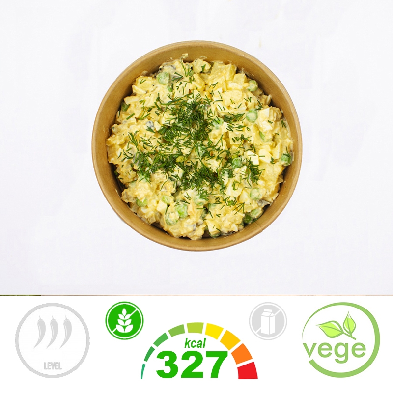 Składniki: Ziemniaki (19%), Ogórki Kiszone (Ogórki, Woda, Sól, Przyprawy w tym GORCZYCA) (15%), JAJA KURZE Gotowane i Obrane, Woda, Sól, Regulatory Kwasowości: Kwas Cytrynowy, Kwas Octowy, Kwas Mlekowy, Marchew, Pietruszka, SELER, Groszek Zielony, Majonez Domowy (Olej Rzepakowy, Pasteryzowane Żółtka JAJ, Musztarda), Musztarda (Woda, Ocet Spirytusowy, GORCZYCA, Cukier, Sól, Przyprawy), Natka Pietruszki, Sól, Pieprz Czarny.