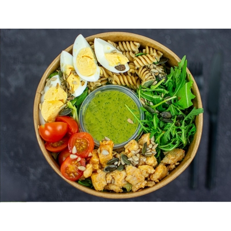 Składniki: Kurczak 19,8% (udka z kurczaka 73,4%, sos chili słodki (cukier, woda, chili 16 %, czosnek, sól, modyfikowana skrobia kukurydziana, regulator kwasowości: kwas octowy) 25,8%, olej rzepakowy 0,5%, papryka słodka 0,3%), Makaron razowy 17% (makaron świderki razowy (mąka razowa z PSZENICY durum) 99,9%, sól 0,1%), Pomidorki cherry 16,8%, Sos 14,3% (oliwa z oliwek 44,1%, woda 14,7%, ocet winny 13,2%, musztarda (woda, ocet spirytusowy, GORCZYCA biała, GORCZYCA czarna, cukier, sól, przyprawy, barwnik: kurkumina) 11,8%, bazylia suszona 2,9%, bazylia 2,9%, koper 2,9%, szczypiorek 2,9%, natka pietruszki 2,9%, miód 1,5%), Mix sałat 14% (mix sałat (rukola, cykoria escarola, endywia frisee, radicchio) 100%), Jajka 12,6%, Rukola 4,2%, Słonecznik prażony 0,6%, Pestki dyni 0,6%.